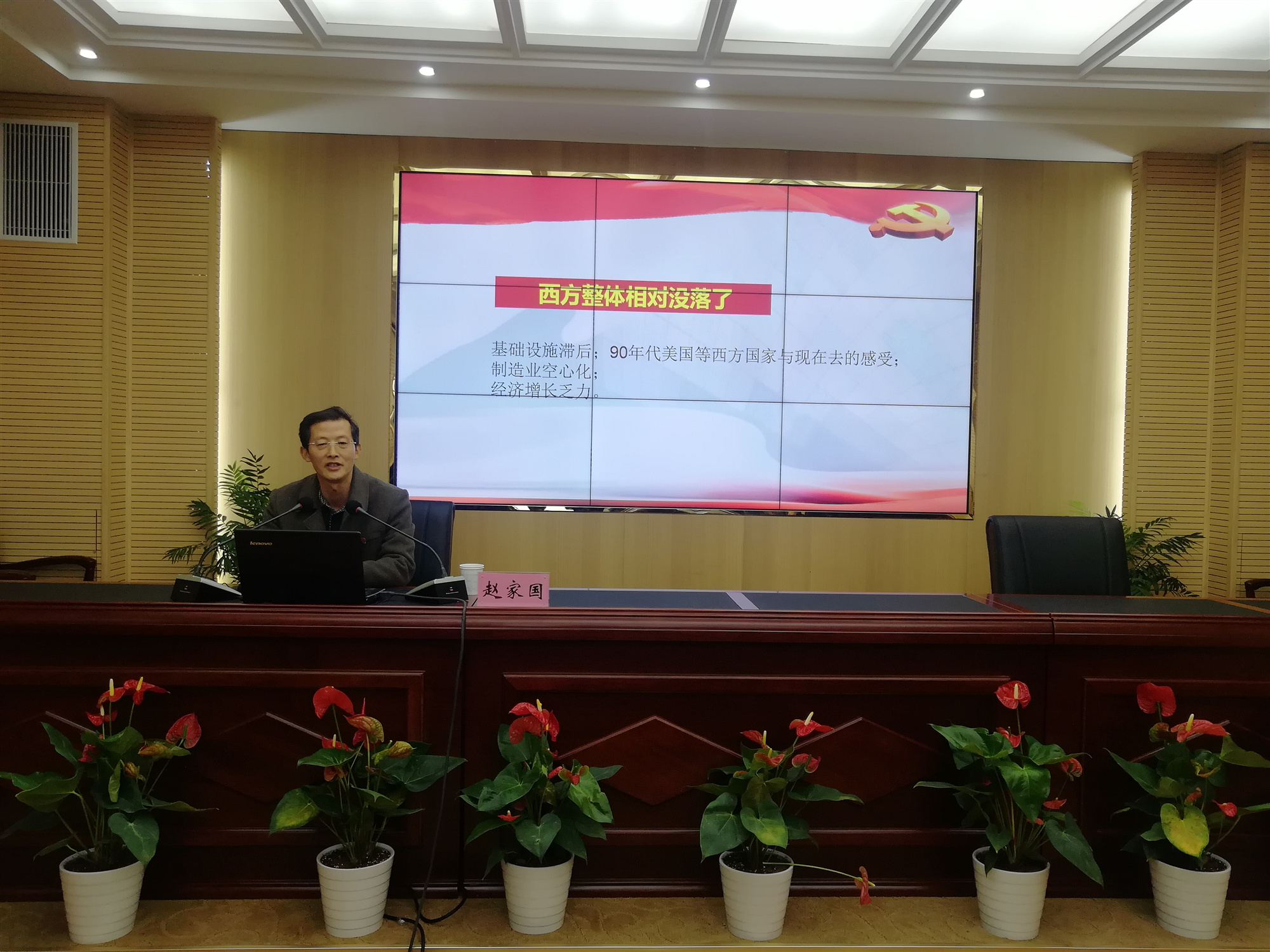 接著,趙家國教授以“12345”為提綱挈領(lǐng),結(jié)合國內(nèi)國外形勢,為大家詳細解讀了黨的十九屆五中全會精神的精髓和要義?!?”是一個重大判斷揭示未來發(fā)展環(huán)境異常復(fù)雜:《建議》提出當前和今后一個時期,我國發(fā)展仍然處于重要戰(zhàn)略機遇期,但機遇和挑戰(zhàn)都有新的發(fā)展變化?!?”是兩個全局了然于胸謀劃未來:《 建議》指出全黨要統(tǒng)籌中華民族偉大復(fù)興戰(zhàn)略全局和世界百年未有之大變局,深刻認識我國社會主要矛盾變化帶來的新特征新要求....。我們從這兩個大局出發(fā)來制定規(guī)劃?!?”是三個“新”揭示新征程無比豪邁:新階段、新發(fā)展理念、新發(fā)展格局?!?”是四個首次展現(xiàn)復(fù)興圖強雄心壯志:堅持創(chuàng)新在我國現(xiàn)代化建設(shè)全局中的核心地位,首次把全體人民共同富裕取得更為明顯的實質(zhì)進展作為遠景目標提出,首次明確了建成文化強國的具體時間表,明確提出到2035年建成文化大國,首次提出確保二〇二七年實現(xiàn)建軍百年奮斗目標?!?”是五大原則體現(xiàn)黨的領(lǐng)導(dǎo)更加成熟高超:堅持黨的全面領(lǐng)導(dǎo),堅持以人民為中心,堅持新發(fā)展理念,堅持深化改革開放,堅持系統(tǒng)觀念。